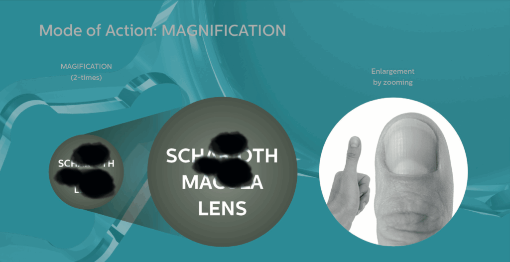 I dati statistici ci dicono che i pazienti maculopatici sono tanti e in aumento. L’abuso di schermi digitali è la principale causa della diffusione della patologia. Per contrastarla oggi nella maggior parte dei casi oggi gli oculisti prescrivono degli integratori da assumere per via orale. Tuttavia questi farmaci spesso hanno scarsa efficacia e producono pochi benefici. Il Dr Edoardo Ligabue, che nella sua attività ambulatoriale diagnostica diversi casi di maculopatia, è tra i pionieri di diverse tecnologie progettate per contrastare la maculopatia, come iniezioni intravitreali, fotobiomodulazione retinica Valeda e Iontoretina. Ora si appresta ad utilizzare anche la Schariot Macula Lens (SML). La lente, che prende il nome dal suo inventore, il Prof Gabor Schariot, è una nuova opzione per i pazienti affetti da degenerazione maculare secca. Il design particolare di questa lente, che va posizionata davanti al cristallino artificiale (l’impianto viene eseguito in occhi pseudofachici, ossia che hanno già subito l’intervento di cataratta), permette di zoomare con una potenza di x2,5 nella visione da vicino. È come avere un occhialino da vicino da +6.0 diottrie, una sorta di lente d’ingrandimento incorporata che entra in azione solo per la visione da vicino. In questo modo lo scotoma, pur rimanendo, copre una porzione “meno invasiva”, come si può apprezzare nell’immagine qui sotto.